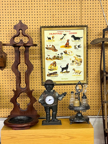 Walnut umbrella stand , caster set, hunting poster, banjo player bank